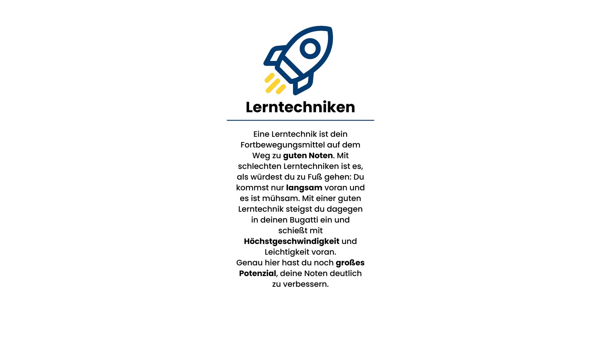 Eine Lerntechnik ist dein Fortbewegungsmittel auf dem Weg zu guten Noten. Mit schlechten Lerntechniken ist es, als würdest du zu Fuß gehen: Du kommst nur langsam voran und es ist mühsam. Mit einer guten Lerntechnik steigst du dagegen in deinen Bugatti ein und schießt mit Höchstgeschwindigkeit und Leichtigkeit voran.