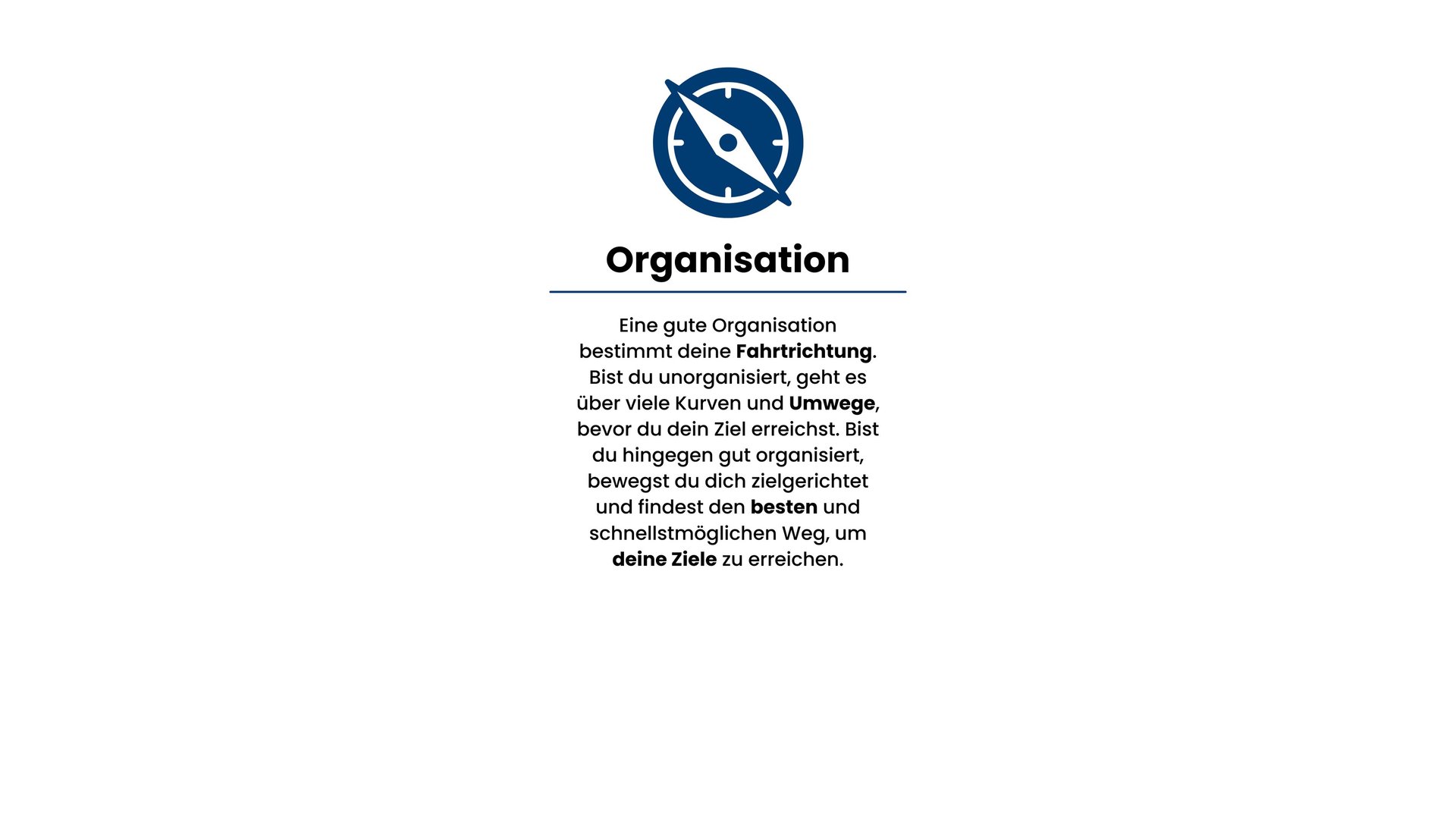 Eine gute Organisation bestimmt deine Fahrtrichtung. Bist du unorganisiert, geht es über viele Kurven und Umwege, bevor du dein Ziel erreichst. Bist du hingegen gut organisiert, bewegst du dich zielgerichtet und findest den besten und schnellstmöglichen Weg, um deine Ziele zu erreichen.